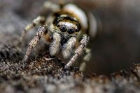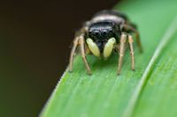 Die Zebraspringspinne gehört zu den häufigsten Arten in unseren Breitengraden und ist oft in der Nähe von Siedlungen an Mauern, aber auch im Haus zu finden. Die Grösse beträgt 4 - 7 mm, Männchen (letztes Bild) bleiben etwas kleiner, besitzen dafür beinahe grotesk verlängerte Kieferklauen (Cheliceren), die sie auch bei Revierkämpfen einsetzen.
