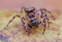Different species of jumping spiders hunt for different prey. Some are specialized to feed almost only on Mosquitos with a preference on those who recently sucked blood. Others steal the prey out of spiderwebs and, if not careful enough, the owner of the web as well. Even other species of jumping spiders can become the prey of a jumping spider.