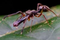 Once jumping distance is reached and the dragline secured the spider jumps onto the potential prey. As soon as contact is made the jumping spider grabs the victim with its front legs and administers a bite to inject rapidly acting poison that immobilizes it immediately, giving the prey almost no time to react. This explains why the pray can be much larger and stronger than the spider itself.
