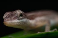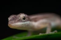 A single image from a series of ten images, only the tip of the anole lizard's nose is in focus.