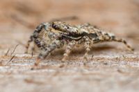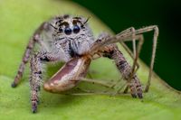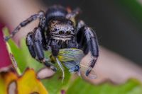 Jumping spiders are extremely skilled hunters and are able to take down prey that is a lot larger than the spider itself. The preferences of the different species are very different. Even within the same species there are both brave and hesitant individuals. The most common are probably opportunistic hunters, who seize every opportunity that presents itself. The hunting tactics are very variable. Some species like "Phaecius sp." lurk for hours looking down and motionless on tree trunks for insects that come too close. Others actively roam their territory and sneak up on their prey like a big cat on a gazelle.