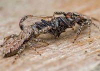 Once the potential prey is within reach of the spider, it attaches a strand of silk to the surface and prepares to jump. As soon as the sensory hairs on the front legs report contact, they immediately attack and a poisonous bite is applied. Thorn-like hairs on the front legs secure the grip until the venom takes effect and immobilizes the prey, and the safety rope provides support as long as the prey struggles.